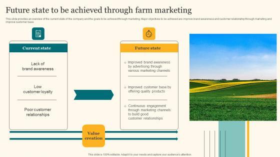 This slide provides an overview of the current state of the company and the goals to be achieved through marketing. Major objectives to be achieved are improve brand awareness and customer relationship through marketing and improve customer base. The best PPT templates are a great way to save time, energy, and resources. Slidegeeks have 100 percent editable powerpoint slides making them incredibly versatile. With these quality presentation templates, you can create a captivating and memorable presentation by combining visually appealing slides and effectively communicating your message. Download Future State To Be Achieved Through Farm Marketing Agricultural Product Promotion Guidelines Pdf from Slidegeeks and deliver a wonderful presentation. This slide provides an overview of the current state of the company and the goals to be achieved through marketing. Major objectives to be achieved are improve brand awareness and customer relationship through marketing and improve customer base.