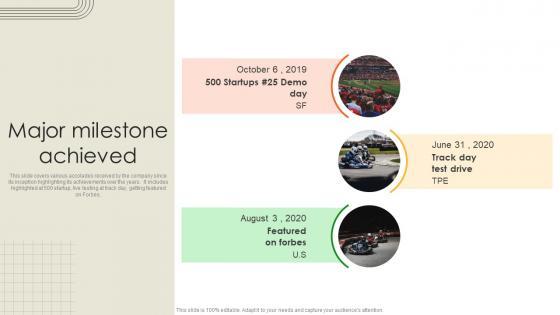 This slide covers various accolades received by the company since its inception highlighting its achievements over the years. It includes highlighted at 500 startup, live testing at track day, getting featured on Forbes. If your project calls for a presentation, then Slidegeeks is your go-to partner because we have professionally designed, easy-to-edit templates that are perfect for any presentation. After downloading, you can easily edit Major Milestone Achieved Battery Production Firm Investor Funding Elevator Pitch Deck and make the changes accordingly. You can rearrange slides or fill them with different images. Check out all the handy templates This slide covers various accolades received by the company since its inception highlighting its achievements over the years. It includes highlighted at 500 startup, live testing at track day, getting featured on Forbes.