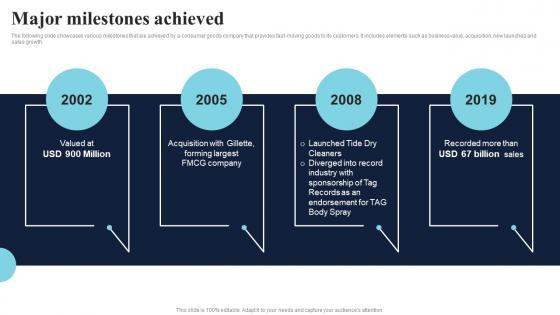 The following slide showcases various milestones that are achieved by a consumer goods company that provides fast moving goods to its customers. It includes elements such as business value, acquisition, new launches and sales growth. If you are looking for a format to display your unique thoughts, then the professionally designed Major Milestones Achieved FMCG Products Investor Funding Ppt Sample is the one for you. You can use it as a Google Slides template or a PowerPoint template. Incorporate impressive visuals, symbols, images, and other charts. Modify or reorganize the text boxes as you desire. Experiment with shade schemes and font pairings. Alter, share or cooperate with other people on your work. Download Major Milestones Achieved FMCG Products Investor Funding Ppt Sample and find out how to give a successful presentation. Present a perfect display to your team and make your presentation unforgettable. The following slide showcases various milestones that are achieved by a consumer goods company that provides fast moving goods to its customers. It includes elements such as business value, acquisition, new launches and sales growth.
