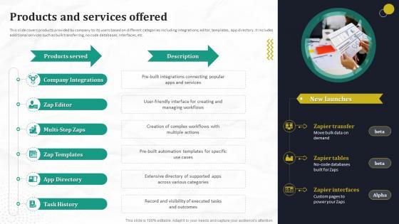 This slide covers products provided by company to its users based on different categories including integrations, editor, templates, app directory. It includes additional services such as bulk transferring, no code databases, interfaces, etc. Formulating a presentation can take up a lot of effort and time, so the content and message should always be the primary focus. The visuals of the PowerPoint can enhance the presenters message, so our Products And Services Offered Automated Workflow Software Funding Pitch Deck For Company was created to help save time. Instead of worrying about the design, the presenter can concentrate on the message while our designers work on creating the ideal templates for whatever situation is needed. Slidegeeks has experts for everything from amazing designs to valuable content, we have put everything into Products And Services Offered Automated Workflow Software Funding Pitch Deck For Company. This slide covers products provided by company to its users based on different categories including integrations, editor, templates, app directory. It includes additional services such as bulk transferring, no code databases, interfaces, etc.