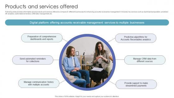 Following slide provides information about products and services offered by company to different businesses for enhancing accounts receivables management. It includes key services such as dashboard preparation, predicted AR analytics, automated reminders, CRM data management, etc. Coming up with a presentation necessitates that the majority of the effort goes into the content and the message you intend to convey. The visuals of a PowerPoint presentation can only be effective if it supplements and supports the story that is being told. Keeping this in mind our experts created Products And Services Offered Investor Funding Pitch Deck For Automated Ar Platform to reduce the time that goes into designing the presentation. This way, you can concentrate on the message while our designers take care of providing you with the right template for the situation. Following slide provides information about products and services offered by company to different businesses for enhancing accounts receivables management. It includes key services such as dashboard preparation, predicted AR analytics, automated reminders, CRM data management, etc.