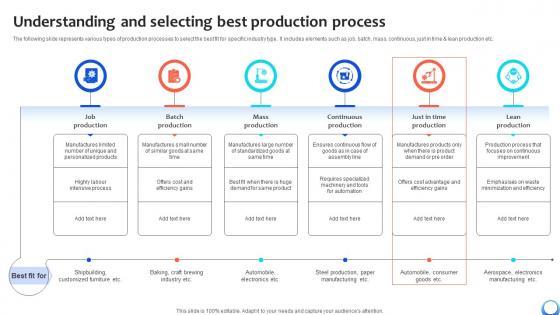 The following slide represents various types of production processes to select the best fit for specific industry type. It includes elements such as job, batch, mass, continuous, just in time and lean production etc. The Understanding And Selecting Best Production Process Automating Production Process Strategy SS V is a compilation of the most recent design trends as a series of slides. It is suitable for any subject or industry presentation, containing attractive visuals and photo spots for businesses to clearly express their messages. This template contains a variety of slides for the user to input data, such as structures to contrast two elements, bullet points, and slides for written information. Slidegeeks is prepared to create an impression. The following slide represents various types of production processes to select the best fit for specific industry type. It includes elements such as job, batch, mass, continuous, just in time and lean production etc.
