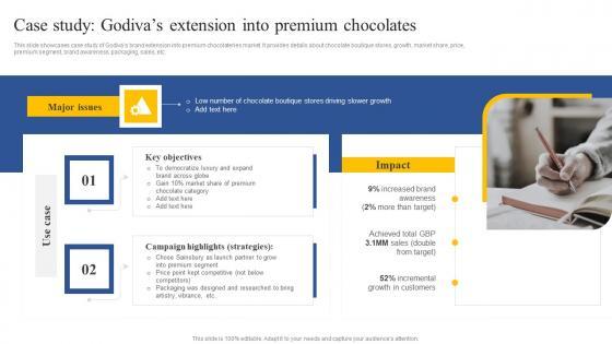 This slide showcases case study of Godivas brand extension into premium chocolateries market. It provides details about chocolate boutique stores, growth, market share, price, premium segment, brand awareness, packaging, sales, etc. Formulating a presentation can take up a lot of effort and time, so the content and message should always be the primary focus. The visuals of the PowerPoint can enhance the presenters message, so our Case Study Godivas Extension Into Premium Chocolates How To Implement Product Information Pdf was created to help save time. Instead of worrying about the design, the presenter can concentrate on the message while our designers work on creating the ideal templates for whatever situation is needed. Slidegeeks has experts for everything from amazing designs to valuable content, we have put everything into Case Study Godivas Extension Into Premium Chocolates How To Implement Product Information Pdf This slide showcases case study of Godivas brand extension into premium chocolateries market. It provides details about chocolate boutique stores, growth, market share, price, premium segment, brand awareness, packaging, sales, etc.