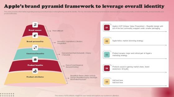 This slide provides information regarding brand pyramid that helps in strengthening overall its identity. The key elements of brand pyramid include brand essence, brand personality, emotional benefits, product benefits and product attributes. Do you have to make sure that everyone on your team knows about any specific topic I yes, then you should give Product Branding Strategy Of Apple Apples Brand Pyramid Framework Introduction Pdfa try. Our experts have put a lot of knowledge and effort into creating this impeccable Product Branding Strategy Of Apple Apples Brand Pyramid Framework Introduction Pdf. You can use this template for your upcoming presentations, as the slides are perfect to represent even the tiniest detail. You can download these templates from the Slidegeeks website and these are easy to edit. So grab these today. This slide provides information regarding brand pyramid that helps in strengthening overall its identity. The key elements of brand pyramid include brand essence, brand personality, emotional benefits, product benefits and product attributes.