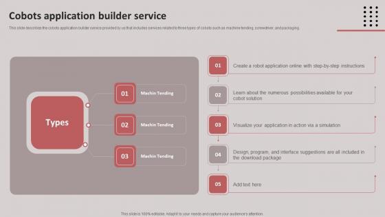 This slide describes the cobots application builder service provided by us that includes services related to three types of cobots such as machine tending, screwdriver, and packaging. Do you have to make sure that everyone on your team knows about any specific topic I yes, then you should give Cobots Application Builder Service Cobots For Improved Productivity Professional PDF a try. Our experts have put a lot of knowledge and effort into creating this impeccable Cobots Application Builder Service Cobots For Improved Productivity Professional PDF You can use this template for your upcoming presentations, as the slides are perfect to represent even the tiniest detail. You can download these templates from the Slidegeeks website and these are easy to edit. So grab these today This slide describes the cobots application builder service provided by us that includes services related to three types of cobots such as machine tending, screwdriver, and packaging.