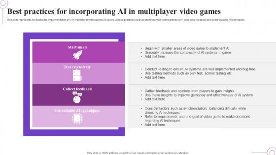 This slide represents key tactics for implementation of AI in multiplayer video games. It covers various practices such as starting small, testing extensively, collecting feedback and using suitable AI techniques.Pitch your topic with ease and precision using this Best Practices For Incorporating AI In Multiplayer Video Games Professional Pdf This layout presents information on Synchronization Balancing, Gameplay Effectiveness, Regarding Techniques It is also available for immediate download and adjustment. So, changes can be made in the color, design, graphics or any other component to create a unique layout. This slide represents key tactics for implementation of AI in multiplayer video games. It covers various practices such as starting small, testing extensively, collecting feedback and using suitable AI techniques.