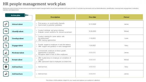 Mentioned slide includes human resource work plan for talent management to recruit best candidate to fill open job roles. It includes key elements such as talent attraction, identification, development, engagement, motivation, retention and deployment. Showcasing this set of slides titled HR People Management Work Plan Professional Pdf. The topics addressed in these templates are Attract Talent, Identify Talent, Develop Talent. All the content presented in this PPT design is completely editable. Download it and make adjustments in color, background, font etc. as per your unique business setting. Mentioned slide includes human resource work plan for talent management to recruit best candidate to fill open job roles. It includes key elements such as talent attraction, identification, development, engagement, motivation, retention and deployment.