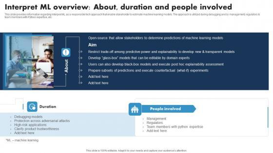This slide provides information regarding Interpret ML as a responsible tech approach that enable stakeholder to estimate machine learning models. The approach is utilized during debugging and by management, regulators and team members with Python expertise, etc. The Interpret ML Overview About Duration And People Responsible Tech Guide To Manage Professional Pdf is a compilation of the most recent design trends as a series of slides. It is suitable for any subject or industry presentation, containing attractive visuals and photo spots for businesses to clearly express their messages. This template contains a variety of slides for the user to input data, such as structures to contrast two elements, bullet points, and slides for written information. Slidegeeks is prepared to create an impression. This slide provides information regarding Interpret ML as a responsible tech approach that enable stakeholder to estimate machine learning models. The approach is utilized during debugging and by management, regulators and team members with Python expertise, etc.