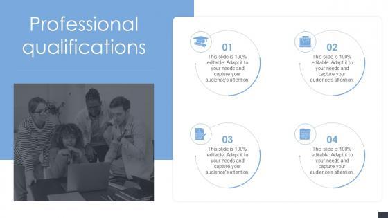 This is a professional qualifications ppt powerpoint presentation infographic template layouts. This is a four stage process. The stages in this process are qualifications, business, marketing, strategy, icons.