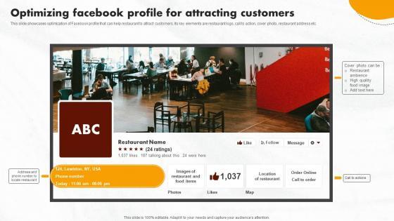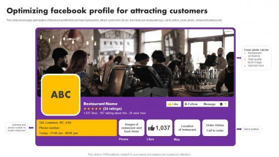 This slide showcases optimization of Facebook profile that can help restaurant to attract customers. Its key elements are restaurant logo, call to action, cover photo, restaurant address etc..Do you know about Slidesgeeks Digital Marketing Plan For Restaurant Business Optimizing Facebook Profile For Attracting Customers Icons PDF These are perfect for delivering any kind od presentation. Using it, create PowerPoint presentations that communicate your ideas and engage audiences. Save time and effort by using our pre-designed presentation templates that are perfect for a wide range of topic. Our vast selection of designs covers a range of styles, from creative to business, and are all highly customizable and easy to edit. Download as a PowerPoint template or use them as Google Slides themes.