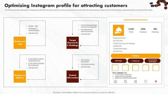 This slide showcases optimization of Instagram profile that can help restaurant to attract customers. Its key elements are restaurant logo, target keywords and hashtags, restaurant address and contact information The Coffeehouse Promotion Techniques To Boost Revenue Optimizing Instagram Profile For Attracting Demonstration PDF is a compilation of the most recent design trends as a series of slides. It is suitable for any subject or industry presentation, containing attractive visuals and photo spots for businesses to clearly express their messages. This template contains a variety of slides for the user to input data, such as structures to contrast two elements, bullet points, and slides for written information. Slidegeeks is prepared to create an impression.