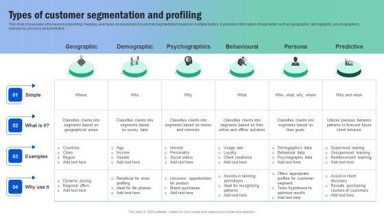 This slide showcases a framework presenting meaning, examples and purpose of customer segmentation based on multiple factors. It provides information of segments such as geographic, demographic, psychographics, behavioral, persona and predictive. Coming up with a presentation necessitates that the majority of the effort goes into the content and the message you intend to convey. The visuals of a PowerPoint presentation can only be effective if it supplements and supports the story that is being told. Keeping this in mind our experts created Types Of Customer Segmentation And Profiling Guide For Segmenting And Formulating Themes Pdf to reduce the time that goes into designing the presentation. This way, you can concentrate on the message while our designers take care of providing you with the right template for the situation. This slide showcases a framework presenting meaning, examples and purpose of customer segmentation based on multiple factors. It provides information of segments such as geographic, demographic, psychographics, behavioral, persona and predictive.