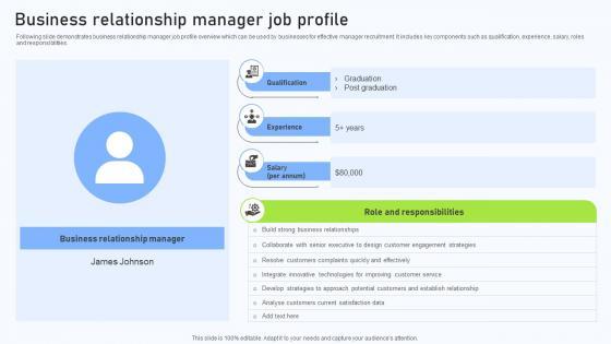 Following slide demonstrates business relationship manager job profile overview which can be used by businesses for effective manager recruitment. It includes key components such as qualification, experience, salary, roles and responsibilities. Do you know about Slidesgeeks Relationship Management Automation Software Business Relationship Manager Job Profile These are perfect for delivering any kind od presentation. Using it, create PowerPoint presentations that communicate your ideas and engage audiences. Save time and effort by using our pre-designed presentation templates that are perfect for a wide range of topic. Our vast selection of designs covers a range of styles, from creative to business, and are all highly customizable and easy to edit. Download as a PowerPoint template or use them as Google Slides themes. Following slide demonstrates business relationship manager job profile overview which can be used by businesses for effective manager recruitment. It includes key components such as qualification, experience, salary, roles and responsibilities.