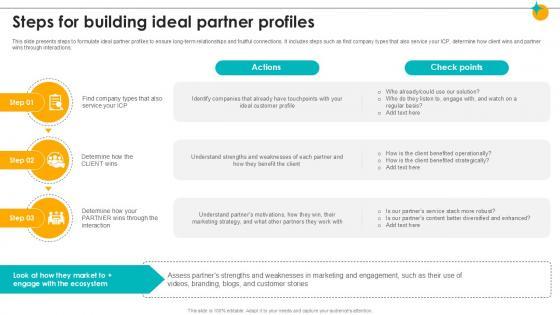 This slide presents steps to formulate ideal partner profiles to ensure long-term relationships and fruitful connections. It includes steps such as find company types that also service your ICP, determine how client wins and partner wins through interactions. If you are looking for a format to display your unique thoughts, then the professionally designed Steps For Building Ideal Partner Profiles Partner Relationship Ppt Slides is the one for you. You can use it as a Google Slides template or a PowerPoint template. Incorporate impressive visuals, symbols, images, and other charts. Modify or reorganize the text boxes as you desire. Experiment with shade schemes and font pairings. Alter, share or cooperate with other people on your work. Download Steps For Building Ideal Partner Profiles Partner Relationship Ppt Slides and find out how to give a successful presentation. Present a perfect display to your team and make your presentation unforgettable. This slide presents steps to formulate ideal partner profiles to ensure long term relationships and fruitful connections. It includes steps such as find company types that also service your ICP, determine how client wins and partner wins through interactions.