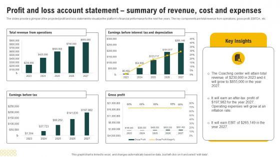 The slides provide a glimpse of the projected profit and loss statement to visualize the platforms financial performance for the next five years. The key components are total revenue from operations, gross profit, EBITDA, etc. Do you have to make sure that everyone on your team knows about any specific topic I yes, then you should give Profit And Loss Account Statement Summary Coaching Business Plan Financial Projections Clipart Pdf a try. Our experts have put a lot of knowledge and effort into creating this impeccable Profit And Loss Account Statement Summary Coaching Business Plan Financial Projections Clipart Pdf. You can use this template for your upcoming presentations, as the slides are perfect to represent even the tiniest detail. You can download these templates from the Slidegeeks website and these are easy to edit. So grab these today The slides provide a glimpse of the projected profit and loss statement to visualize the platforms financial performance for the next five years. The key components are total revenue from operations, gross profit, EBITDA, etc.