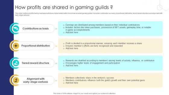 This slide mentions profit sharing mechanisms that are implemented within blockchain enabled gaming guilds. It includes contribution as basis, proportional distribution, tiered reward structure and alignment with early stage ventures. Create an editable Unlocking The Potential Of How Profits Are Shared In Gaming Guilds BCT SS V that communicates your idea and engages your audience. Whether you are presenting a business or an educational presentation, pre-designed presentation templates help save time. Unlocking The Potential Of How Profits Are Shared In Gaming Guilds BCT SS V is highly customizable and very easy to edit, covering many different styles from creative to business presentations. Slidegeeks has creative team members who have crafted amazing templates. So, go and get them without any delay. This slide mentions profit sharing mechanisms that are implemented within blockchain enabled gaming guilds. It includes contribution as basis, proportional distribution, tiered reward structure and alignment with early stage ventures.