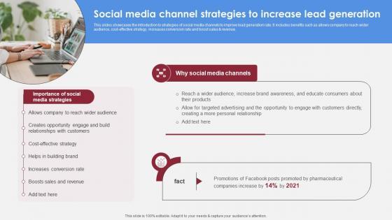 This slides showcases the introduction to strategies of social media channels to improve lead generation rate. It includes benefits such as allows company to reach wider audience, cost-effective strategy, increases conversion rate and boost sales and revenue. Do you have to make sure that everyone on your team knows about any specific topic I yes, then you should give Social Media Channel Strategies To Increase Accelerating Market Share And Profitability MKT SS V a try. Our experts have put a lot of knowledge and effort into creating this impeccable Social Media Channel Strategies To Increase Accelerating Market Share And Profitability MKT SS V. You can use this template for your upcoming presentations, as the slides are perfect to represent even the tiniest detail. You can download these templates from the Slidegeeks website and these are easy to edit. So grab these today This slides showcases the introduction to strategies of social media channels to improve lead generation rate. It includes benefits such as allows company to reach wider audience, cost-effective strategy, increases conversion rate and boost sales and revenue.