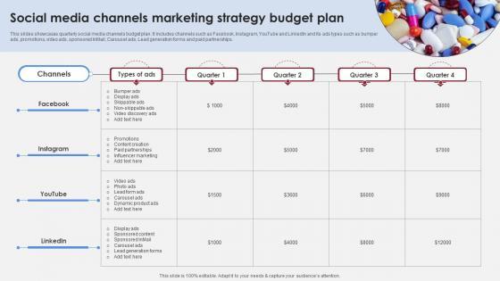 This slides showcases quarterly social media channels budget plan. It includes channels such as Facebook, Instagram, YouTube and LinkedIn and its ads types such as bumper ads, promotions, video ads, sponsored InMail, Carousel ads, Lead generation forms and paid partnerships. Get a simple yet stunning designed Social Media Channels Marketing Strategy Accelerating Market Share And Profitability MKT SS V. It is the best one to establish the tone in your meetings. It is an excellent way to make your presentations highly effective. So, download this PPT today from Slidegeeks and see the positive impacts. Our easy-to-edit Social Media Channels Marketing Strategy Accelerating Market Share And Profitability MKT SS V can be your go-to option for all upcoming conferences and meetings. So, what are you waiting for Grab this template today. This slides showcases quarterly social media channels budget plan. It includes channels such as Facebook, Instagram, YouTube and LinkedIn and its ads types such as bumper ads, promotions, video ads, sponsored InMail, Carousel ads, Lead generation forms and paid partnerships.