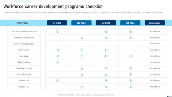 This slide showcases a list that can help our business to train our team and organize different career development plans for them. It includes activities such as team based business stimulation, collaboration project work, etc. Are you searching for a Workforce Career Development Programs Checklist Strategic Talent Recruitment Rules Pdf that is uncluttered, straightforward, and original Its easy to edit, and you can change the colors to suit your personal or business branding. For a presentation that expresses how much effort you have put in, this template is ideal With all of its features, including tables, diagrams, statistics, and lists, its perfect for a business plan presentation. Make your ideas more appealing with these professional slides. Download Workforce Career Development Programs Checklist Strategic Talent Recruitment Rules Pdf from Slidegeeks today. This slide showcases a list that can help our business to train our team and organize different career development plans for them. It includes activities such as team based business stimulation, collaboration project work, etc.