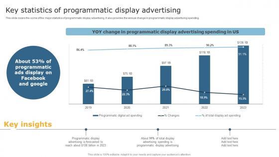 This slide covers the some of the major statistics of programmatic display advertising. It also provides the annual change in programmatic display advertising spending. Presenting this PowerPoint presentation, titled Key Statistics Of Programmatic Display Advertising Pictures PDF, with topics curated by our researchers after extensive research. This editable presentation is available for immediate download and provides attractive features when used. Download now and captivate your audience. Presenting this Key Statistics Of Programmatic Display Advertising Pictures PDF. Our researchers have carefully researched and created these slides with all aspects taken into consideration. This is a completely customizable Key Statistics Of Programmatic Display Advertising Pictures PDF that is available for immediate downloading. Download now and make an impact on your audience. Highlight the attractive features available with our PPTs.