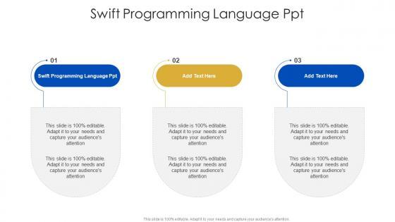 Introducing our well-designed Swift Programming Language Ppt In Powerpoint And Google Slides Cpb. This PowerPoint design presents information on topics like Swift Programming Language Ppt. As it is predesigned it helps boost your confidence level. It also makes you a better presenter because of its high-quality content and graphics. This PPT layout can be downloaded and used in different formats like PDF, PNG, and JPG. Not only this, it is available in both Standard Screen and Widescreen aspect ratios for your convenience. Therefore, click on the download button now to persuade and impress your audience. Our Swift Programming Language Ppt In Powerpoint And Google Slides Cpb are topically designed to provide an attractive backdrop to any subject. Use them to look like a presentation pro.