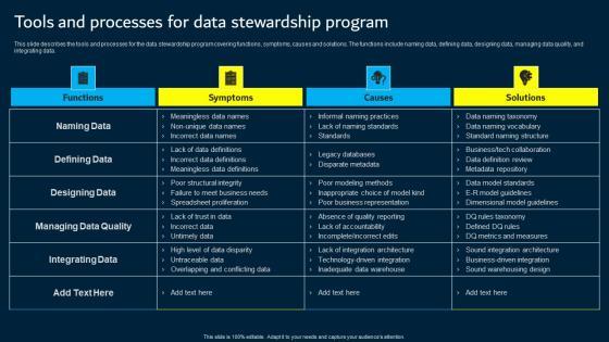 This slide describes the tools and processes for the data stewardship program covering functions, symptoms, causes and solutions. The functions include naming data, defining data, designing data, managing data quality, and integrating data. This Tools And Processes For Data Stewardship Program Data Custodianship Structure Pdf from Slidegeeks makes it easy to present information on your topic with precision. It provides customization options, so you can make changes to the colors, design, graphics, or any other component to create a unique layout. It is also available for immediate download, so you can begin using it right away. Slidegeeks has done good research to ensure that you have everything you need to make your presentation stand out. Make a name out there for a brilliant performance. This slide describes the tools and processes for the data stewardship program covering functions, symptoms, causes and solutions. The functions include naming data, defining data, designing data, managing data quality, and integrating data.