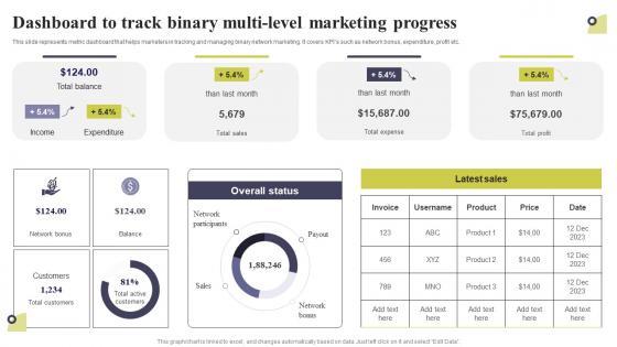 This slide represents metric dashboard that helps marketers in tracking and managing binary network marketing. It covers KPIs such as network bonus, expenditure, profit etc. Are you in need of a template that can accommodate all of your creative concepts This one is crafted professionally and can be altered to fit any style. Use it with Google Slides or PowerPoint. Include striking photographs, symbols, depictions, and other visuals. Fill, move around, or remove text boxes as desired. Test out color palettes and font mixtures. Edit and save your work, or work with colleagues. Download Dashboard To Track Binary Multi Level Marketing Progress Multi Level Marketing Infographics Pdf and observe how to make your presentation outstanding. Give an impeccable presentation to your group and make your presentation unforgettable. This slide represents metric dashboard that helps marketers in tracking and managing binary network marketing. It covers KPIs such as network bonus, expenditure, profit etc.