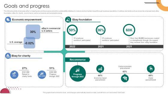 The following slide showcases eBays impact goals and its progress about its sustainability initiatives to reduce environmental impact through business operations. It outlines elements such as economic empowerment, eBay foundation, eBay for charity, recommerce, carbon emissions and renewable energy.Are you in need of a template that can accommodate all of your creative concepts This one is crafted professionally and can be altered to fit any style. Use it with Google Slides or PowerPoint. Include striking photographs, symbols, depictions, and other visuals. Fill, move around, or remove text boxes as desired. Test out color palettes and font mixtures. Edit and save your work, or work with colleagues. Download Goals And Progress C2C Ecommerce Platform Company Profile CP SS V and observe how to make your presentation outstanding. Give an impeccable presentation to your group and make your presentation unforgettable. The following slide showcases eBays impact goals and its progress about its sustainability initiatives to reduce environmental impact through business operations. It outlines elements such as economic empowerment, eBay foundation, eBay for charity, recommerce, carbon emissions and renewable energy.
