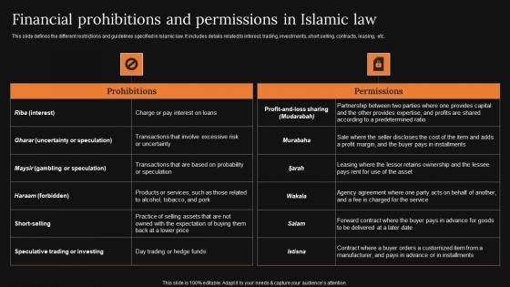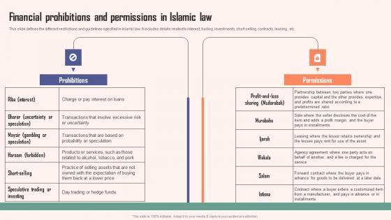 This slide defines the different restrictions and guidelines specified in Islamic law. It includes details related to interest, trading, investments, short selling, contracts, leasing, etc. Explore a selection of the finest Financial Prohibitions And Permissions In Comprehensive Guide Islamic Structure PDF here. With a plethora of professionally designed and pre-made slide templates, you can quickly and easily find the right one for your upcoming presentation. You can use our Financial Prohibitions And Permissions In Comprehensive Guide Islamic Structure PDF to effectively convey your message to a wider audience. Slidegeeks has done a lot of research before preparing these presentation templates. The content can be personalized and the slides are highly editable. Grab templates today from Slidegeeks. This slide defines the different restrictions and guidelines specified in Islamic law. It includes details related to interest, trading, investments, short selling, contracts, leasing, etc.