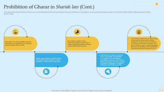 This slide defines the prohibition of Gharar, an essential aspect of Islamic finance that aims to promote fairness, transparency, and responsible business practices. It includes details related to different levels of Gharar and its details. From laying roadmaps to briefing everything in detail, our templates are perfect for you. You can set the stage with your presentation slides. All you have to do is download these easy-to-edit and customizable templates. Prohibition Of Gharar In Shariah Law Comprehensive Guide To Islamic Background Pdf will help you deliver an outstanding performance that everyone would remember and praise you for. Do download this presentation today. This slide defines the prohibition of Gharar, an essential aspect of Islamic finance that aims to promote fairness, transparency, and responsible business practices. It includes details related to different levels of Gharar and its details.