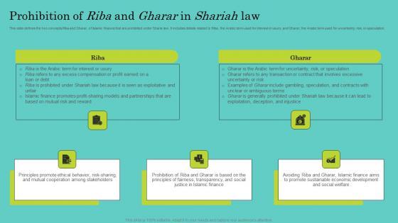This slide defines the two concepts Riba and Gharar, of Islamic finance that are prohibited under Sharia law. It includes details related to Riba, the Arabic term used for interest or usury, and Gharar, the Arabic term used for uncertainty, risk, or speculation. Find highly impressive In Depth Analysis Of Islamic Banking Prohibition Of Riba And Gharar In Shariah Law Summary PDF on Slidegeeks to deliver a meaningful presentation. You can save an ample amount of time using these presentation templates. No need to worry to prepare everything from scratch because Slidegeeks experts have already done a huge research and work for you. You need to download In Depth Analysis Of Islamic Banking Prohibition Of Riba And Gharar In Shariah Law Summary PDF for your upcoming presentation. All the presentation templates are 100 percent editable and you can change the color and personalize the content accordingly. Download now. This slide defines the two concepts Riba and Gharar, of Islamic finance that are prohibited under Sharia law. It includes details related to Riba, the Arabic term used for interest or usury, and Gharar, the Arabic term used for uncertainty, risk, or speculation.