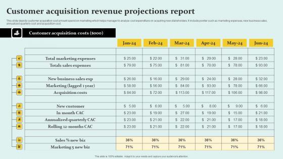 This slide depicts customer acquisition cost amount spend on marketing which helps manager to analyze cost expenditure on acquiring new stakeholders. It include pointer such as marketing expenses, new business sales, annualized quarterly cost and acquisition cost. Pitch your topic with ease and precision using this Customer Acquisition Revenue Projections Report Professional Pdf This layout presents information on Marketing Expenses, Sales Expenses, Business Sales It is also available for immediate download and adjustment. So, changes can be made in the color, design, graphics or any other component to create a unique layout. This slide depicts customer acquisition cost amount spend on marketing which helps manager to analyze cost expenditure on acquiring new stakeholders. It include pointer such as marketing expenses, new business sales, annualized quarterly cost and acquisition cost.