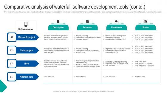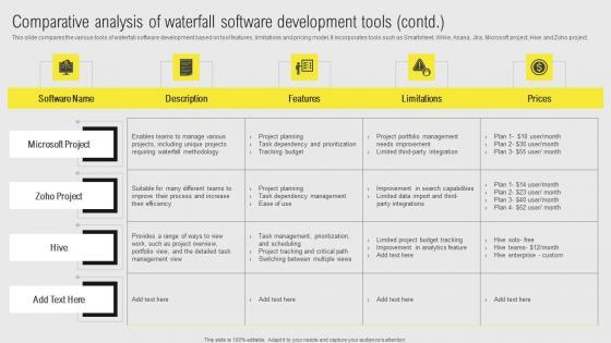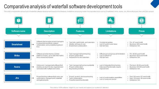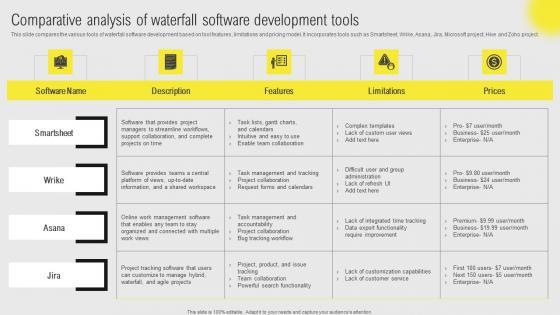 This slide compares the various tools of waterfall software development based on tool features, limitations and pricing model. It incorporates tools such as Smartsheet, Wrike, Asana, Jira, Microsoft project, Hive and Zoho project. Slidegeeks is here to make your presentations a breeze with Comparative Analysis Waterfall Project Management Strategy Construction Industry Template Pdf With our easy to use and customizable templates, you can focus on delivering your ideas rather than worrying about formatting. With a variety of designs to choose from, you are sure to find one that suits your needs. And with animations and unique photos, illustrations, and fonts, you can make your presentation pop. So whether you are giving a sales pitch or presenting to the board, make sure to check out Slidegeeks first This slide compares the various tools of waterfall software development based on tool features, limitations and pricing model. It incorporates tools such as Smartsheet, Wrike, Asana, Jira, Microsoft project, Hive and Zoho project.