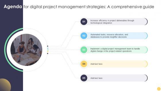 Find a pre-designed and impeccable Agenda For Digital Project Management Strategies A Comprehensive Guide. The templates can ace your presentation without additional effort. You can download these easy-to-edit presentation templates to make your presentation stand out from others. So, what are you waiting for Download the template from Slidegeeks today and give a unique touch to your presentation. Our Agenda For Digital Project Management Strategies A Comprehensive Guide are topically designed to provide an attractive backdrop to any subject. Use them to look like a presentation pro.