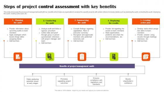 This slide showcases the process of management audit with key benefits which helps an organization to analyze the specific projects with certain criteria.it includes details such as planning the audit, conducting the audit, displaying the audit, creating action plan, etc. Showcasing this set of slides titled Steps Of Project Control Assessment With Key Benefits Infographics Pdf The topics addressed in these templates are Planning The Audit, Conducting The Audit, Summarizing The Audit All the content presented in this PPT design is completely editable. Download it and make adjustments in color, background, font etc. as per your unique business setting. This slide showcases the process of management audit with key benefits which helps an organization to analyze the specific projects with certain criteria.it includes details such as planning the audit, conducting the audit, displaying the audit, creating action plan, etc.