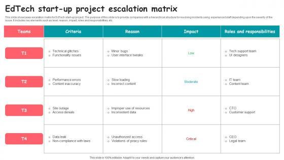 This slide showcases escalation matrix for EdTech start-up project. The purpose of this slide is to provide companies with a hierarchical structure for resolving incidents using experienced staff depending upon the severity of the issue. It includes key elements such as level, reason, impact, roles and responsibilities, etc. Showcasing this set of slides titled Edtech Start Up Project Escalation Matrix Portrait pdf. The topics addressed in these templates are Reason, Impact, Roles And Responsibilities. All the content presented in this PPT design is completely editable. Download it and make adjustments in color, background, font etc. as per your unique business setting. This slide showcases escalation matrix for EdTech start-up project. The purpose of this slide is to provide companies with a hierarchical structure for resolving incidents using experienced staff depending upon the severity of the issue. It includes key elements such as level, reason, impact, roles and responsibilities, etc.