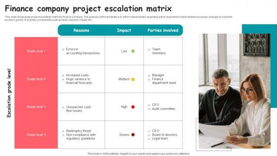 This slide showcases project escalation matrix for finance company. The purpose of this template is to inform stakeholders regarding action required for implementing necessary changes to solve the problem quickly. It includes components such as level, reasons, impact, etc. Pitch your topic with ease and precision using this Finance Company Project Escalation Matrix Slides pdf. This layout presents information on Reasons, Parties Involved, Impact. It is also available for immediate download and adjustment. So, changes can be made in the color, design, graphics or any other component to create a unique layout. This slide showcases project escalation matrix for finance company. The purpose of this template is to inform stakeholders regarding action required for implementing necessary changes to solve the problem quickly. It includes components such as level, reasons, impact, etc.