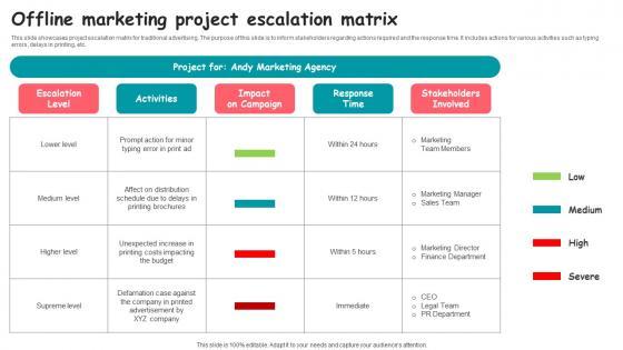 This slide showcases project escalation matrix for traditional advertising. The purpose of this slide is to inform stakeholders regarding actions required and the response time. It includes actions for various activities such as typing errors, delays in printing, etc. Showcasing this set of slides titled Offline Marketing Project Escalation Matrix Professional pdf. The topics addressed in these templates are Response Time, Stakeholders Involved, Activities. All the content presented in this PPT design is completely editable. Download it and make adjustments in color, background, font etc. as per your unique business setting. This slide showcases project escalation matrix for traditional advertising. The purpose of this slide is to inform stakeholders regarding actions required and the response time. It includes actions for various activities such as typing errors, delays in printing, etc.