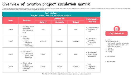This slide highlights detailed escalation matrix for aviation projects. The purpose of this template is to provide upper management with a summary of the state of project. It includes various factors such as level, reasons, stakeholders involved and impact on safety, schedule and budget along with key takeaways. Pitch your topic with ease and precision using this Overview Of Aviation Project Escalation Matrix Graphics pdf. This layout presents information on Crew Members, Maintenance Staff, Problems Require. It is also available for immediate download and adjustment. So, changes can be made in the color, design, graphics or any other component to create a unique layout. This slide highlights detailed escalation matrix for aviation projects. The purpose of this template is to provide upper management with a summary of the state of project. It includes various factors such as level, reasons, stakeholders involved and impact on safety, schedule and budget along with key takeaways.