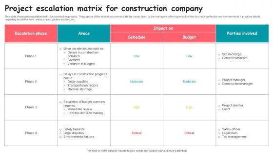 This slide showcases escalation matrix for construction projects. The purpose of this slide is to communicate the issues faced by the managers to the higher authorities for creating effective work environment. It provides details regarding escalation level, areas, impact, parties involved, etc. Showcasing this set of slides titled Project Escalation Matrix For Construction Company Topics pdf. The topics addressed in these templates are Areas, Impact, Parties Involved. All the content presented in this PPT design is completely editable. Download it and make adjustments in color, background, font etc. as per your unique business setting. This slide showcases escalation matrix for construction projects. The purpose of this slide is to communicate the issues faced by the managers to the higher authorities for creating effective work environment. It provides details regarding escalation level, areas, impact, parties involved, etc.