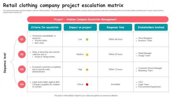 This slide showcases project escalation matrix for clothing retailer. The purpose of this slide is to provide the company with an organized method for handling problems. It includes details regarding level, impact, response time, stakeholders involved, etc. Pitch your topic with ease and precision using this Retail Clothing Company Project Escalation Matrix Formats pdf. This layout presents information on Impact, Response Time, Stakeholders Involved. It is also available for immediate download and adjustment. So, changes can be made in the color, design, graphics or any other component to create a unique layout. This slide showcases project escalation matrix for clothing retailer. The purpose of this slide is to provide the company with an organized method for handling problems. It includes details regarding level, impact, response time, stakeholders involved, etc.