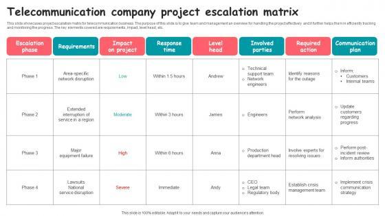 This slide showcases project escalation matrix for telecommunication business. The purpose of this slide is to give team and management an overview for handling the project effectively and it further helps them in efficiently tracking and monitoring the progress. The key elements covered are requirements, impact, level head, etc. Pitch your topic with ease and precision using this Telecommunication Company Project Escalation Matrix Designs pdf. This layout presents information on Requirements, Impact, Level Head. It is also available for immediate download and adjustment. So, changes can be made in the color, design, graphics or any other component to create a unique layout. This slide showcases project escalation matrix for telecommunication business. The purpose of this slide is to give team and management an overview for handling the project effectively and it further helps them in efficiently tracking and monitoring the progress. The key elements covered are requirements, impact, level head, etc.