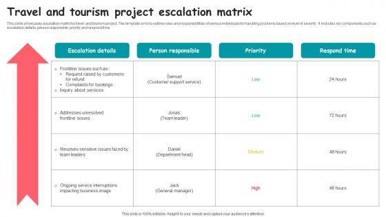 This slide showcases escalation matrix for travel and tourism project. The template sims to outline roles and responsibilities of various individuals for handling problems based on level of severity. It includes key components such as escalation details, person responsible, priority and respond time. Showcasing this set of slides titled Travel And Tourism Project Escalation Matrix Infographics pdf. The topics addressed in these templates are Person Responsible, Priority, Respond Time. All the content presented in this PPT design is completely editable. Download it and make adjustments in color, background, font etc. as per your unique business setting. This slide showcases escalation matrix for travel and tourism project. The template sims to outline roles and responsibilities of various individuals for handling problems based on level of severity. It includes key components such as escalation details, person responsible, priority and respond time.