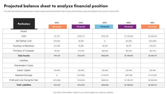This slide represents the projected balance sheet to analyze the financial position of the company which includes assets and liabilities for five years from 2023 to 2027 Do you know about Slidesgeeks Projected Balance Sheet To Analyze Event Management Business Plan Go To Market Strategy Ideas Pdf These are perfect for delivering any kind od presentation. Using it, create PowerPoint presentations that communicate your ideas and engage audiences. Save time and effort by using our pre designed presentation templates that are perfect for a wide range of topic. Our vast selection of designs covers a range of styles, from creative to business, and are all highly customizable and easy to edit. Download as a PowerPoint template or use them as Google Slides themes. This slide represents the projected balance sheet to analyze the financial position of the company which includes assets and liabilities for five years from 2023 to 2027