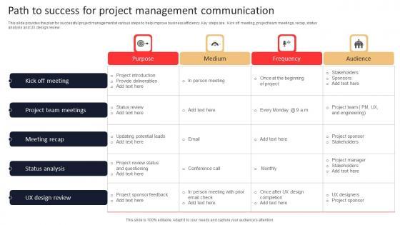 This slide provides the plan for successful project management at various steps to help improve business efficiency. Key steps are Kick off meeting, project team meetings, recap, status analysis and UX design review Pitch your topic with ease and precision using this Path To Success For Project Management Communication Template Pdf. This layout presents information on Project Team Meetings, Status Analysis, Design. It is also available for immediate download and adjustment. So, changes can be made in the color, design, graphics or any other component to create a unique layout. This slide provides the plan for successful project management at various steps to help improve business efficiency. Key steps are Kick off meeting, project team meetings, recap, status analysis and UX design review