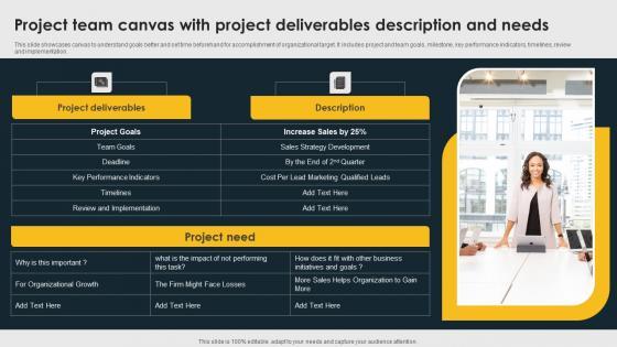 This slide showcases canvas to understand goals better and set time beforehand for accomplishment of organizational target. It includes project and team goals, milestone, key performance indicators, timelines, review and implementation. Pitch your topic with ease and precision using this Project Team Canvas With Project Deliverables Description And Needs Summary Pdf. This layout presents information on Project Deliverables, Description. It is also available for immediate download and adjustment. So, changes can be made in the color, design, graphics or any other component to create a unique layout. This slide showcases canvas to understand goals better and set time beforehand for accomplishment of organizational target. It includes project and team goals, milestone, key performance indicators, timelines, review and implementation.