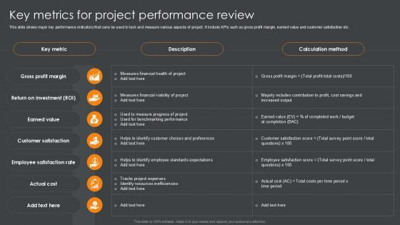 This slide shows major key performance indicators that cane be used to tack and measure various aspects of project. It include KPIs such as gross profit margin, earned value and customer satisfaction etc. There are so many reasons you need a Key Metrics For Project Performance Review PPT Template SS. The first reason is you can not spend time making everything from scratch, Thus, Slidegeeks has made presentation templates for you too. You can easily download these templates from our website easily. This slide shows major key performance indicators that cane be used to tack and measure various aspects of project. It include KPIs such as gross profit margin, earned value and customer satisfaction etc.