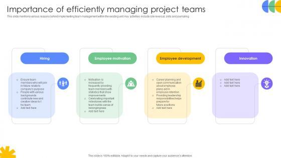 This slide mentions various reasons behind implementing team management within the existing unit. Key activities include role reversal, skits and journaling. Crafting an eye-catching presentation has never been more straightforward. Let your presentation shine with this tasteful yet straightforward Driving Results Designing A Team Importance Of Efficiently Managing Project Teams template. It offers a minimalistic and classy look that is great for making a statement. The colors have been employed intelligently to add a bit of playfulness while still remaining professional. Construct the ideal Driving Results Designing A Team Importance Of Efficiently Managing Project Teams that effortlessly grabs the attention of your audience Begin now and be certain to wow your customers. This slide mentions various reasons behind implementing team management within the existing unit. Key activities include role reversal, skits and journaling.