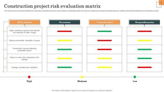 This slide shows risk assessment table of construction project that should be used to deliver sustainable project. It incudes risk categories like higher operating expenses, setting unachievable standards and construction cost etc. Pitch your topic with ease and precision using this Construction Project Risk Evaluation Matrix Survey SS. This layout presents information on Risk Assessment, Construction Project, Deliver Sustainable Project. It is also available for immediate download and adjustment. So, changes can be made in the color, design, graphics or any other component to create a unique layout. This slide shows risk assessment table of construction project that should be used to deliver sustainable project. It incudes risk categories like higher operating expenses, setting unachievable standards and construction cost etc.