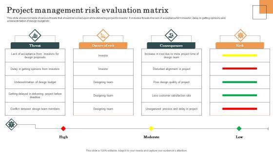 This slide shows risk table of various threats that should be looked upon while delivering project to investor. It includes threats like lack of acceptance form investor, delay in getting opinions and underestimation of design budget etc. Showcasing this set of slides titled Project Management Risk Evaluation Matrix Survey SS. The topics addressed in these templates are Project Management, Risk Evaluation Matrix, Acceptance Form Investor. All the content presented in this PPT design is completely editable. Download it and make adjustments in color, background, font etc. as per your unique business setting. This slide shows risk table of various threats that should be looked upon while delivering project to investor. It includes threats like lack of acceptance form investor, delay in getting opinions and underestimation of design budget etc.